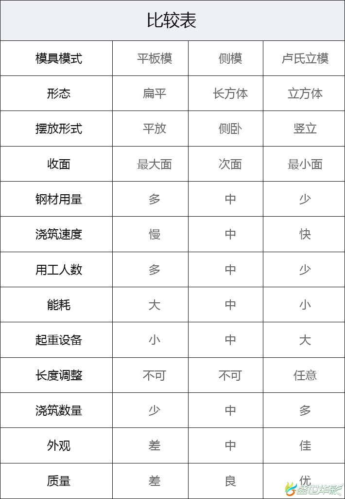 我國建築材料市場上生產墻板的模具門類繁多,有很多款式,按模具的制作、擺放、澆築形式大致可以分為平模、側模、立模三種,它們各自的特點見比較表。