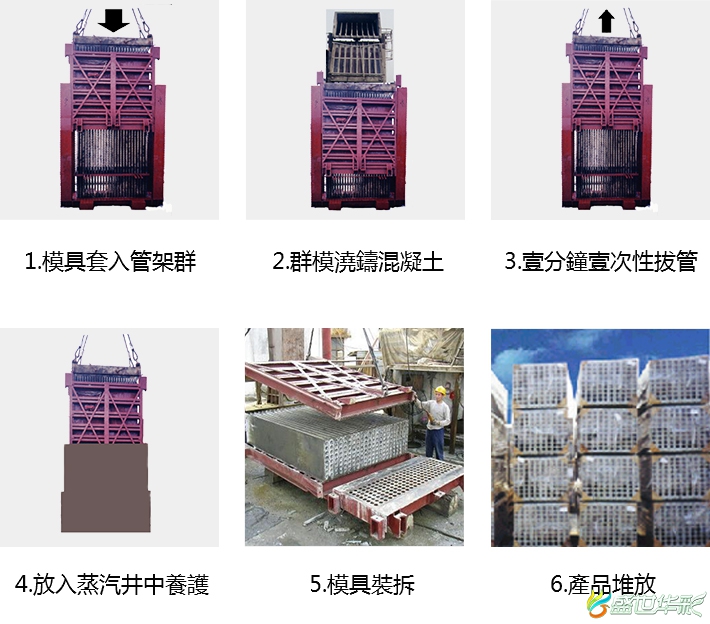 墻板的生產流程是這樣的----按配合比攪拌混凝土----運送設備運送混凝土----混凝土註入“盧氏立模”內----邊震動邊註入(3分鐘內可以澆築完22塊墻板,見模具圖示2)----修飾最小的壹個外面----立模內混凝土達到拔模強度七----拔模與管架分離(上拔式拔模1分鐘內完成,見模具圖示3)----將模具內墻板運送到蒸汽坑養護----墻板達到設計強度----拆卸“盧氏立模”模具----墻板生產完成----清洗模具和隔板----重新組裝“盧氏立模”----吊回坑槽----模具套入管架(5分鐘完成,見圖示1)----循環使用